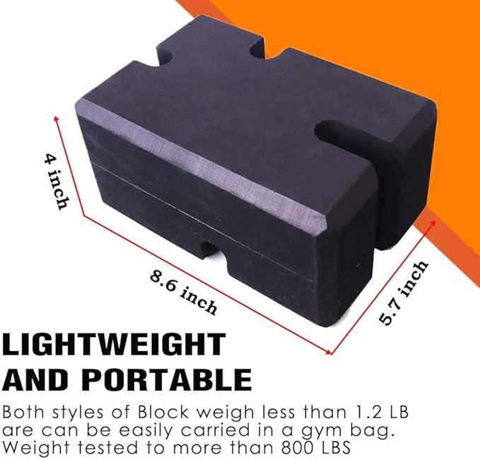 • LIGHTWEIGHT and PORTABLE: Both styles weigh less than 1 lb and can be effortlessly carried in a gym bag. These blocks have been weight tested to support loads exceeding 800 lbs.
