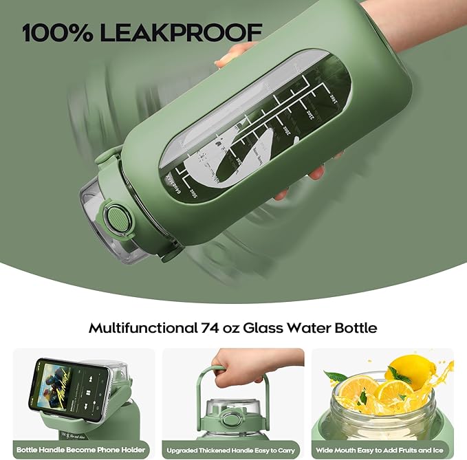 • 【Multifunctional Humanized Design】The 74 oz(2.2L) glass water bottle featured with latest pop up lid with premium O-ring safety lock, 100% leak-proof, and can be easily opened with one hand.The large glass bottles have two ways to drink water by a silicone straw and a hole that can be drink from directly , which is very convenient and fast.