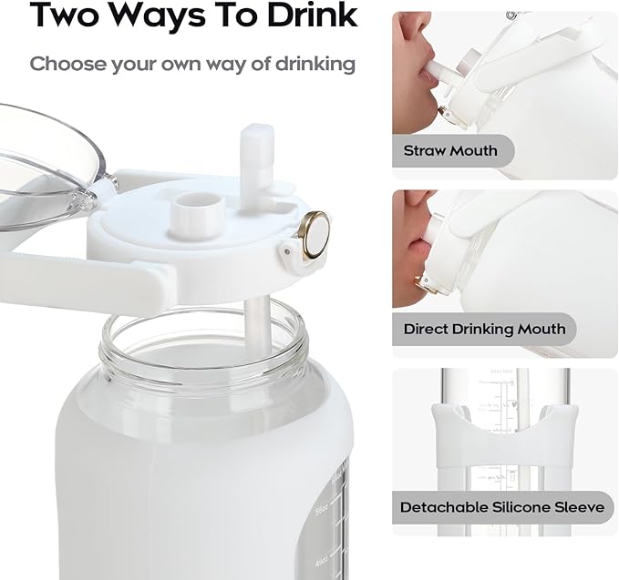 • 【Feature Details】The half gallon(2.2L) water bottle with straw has an anti-slip and high quality silicone sleeve to protect the glass water bottle and help prevent it from being slippery in your hands or slight bumps, it keeps standup stably.In order to make the big gym motivational water bottle easy to carry we have equipped it with handle.