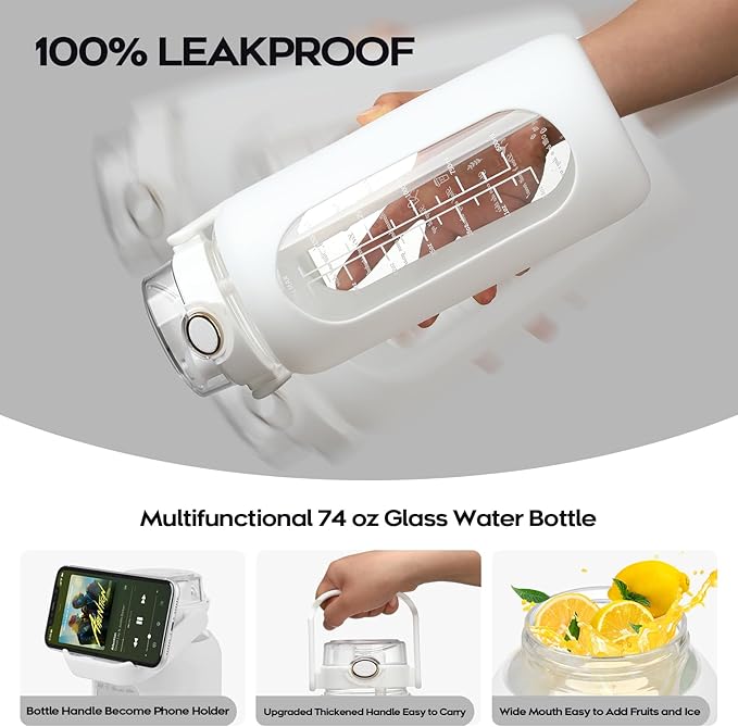 • 【Multifunctional Humanized Design】The 74 oz(2.2L) glass water bottle featured with latest pop up lid with premium O-ring safety lock, 100% leak-proof, and can be easily opened with one hand.The large glass bottles have two ways to drink water by a silicone straw and a hole that can be drink from directly , which is very convenient and fast.