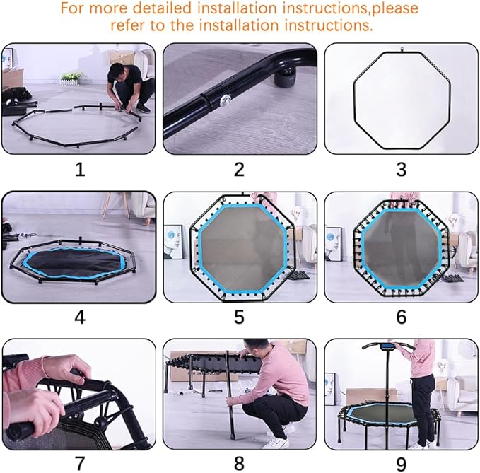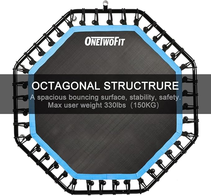 • 【Stable Structural Design】This fitness trampoline is made of STRONG PP MESH,anti-wear and tear resistant octagon rebounding surface,joint-friendly suspension by 40 bungee ropes,thick steel pipe which is 1.2"(30MM) of the diameter, 8 legs supports user up to 330 pounds(150kg)