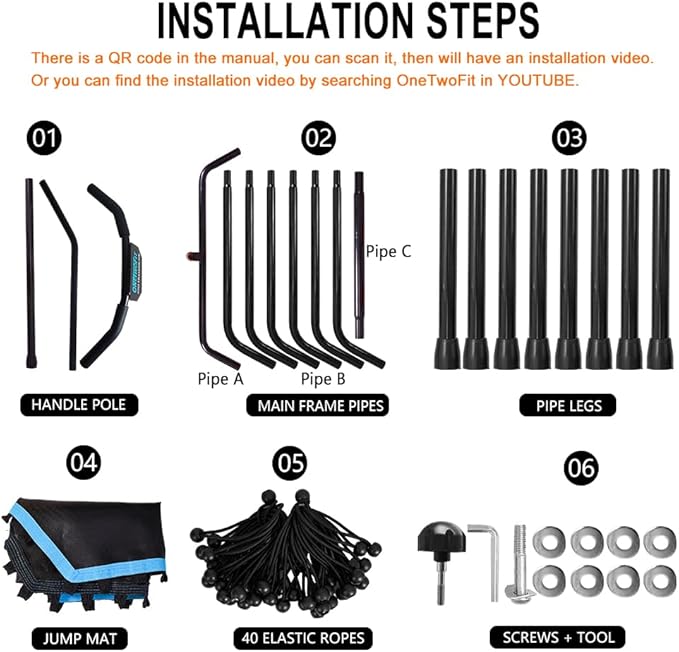 • 【NOTE】Trampoline equipment setup requires some physical labor-please read user manual or find the installation video by searching OneTwoFit in YOUTUBE for set-up and it is best having two people available set-up