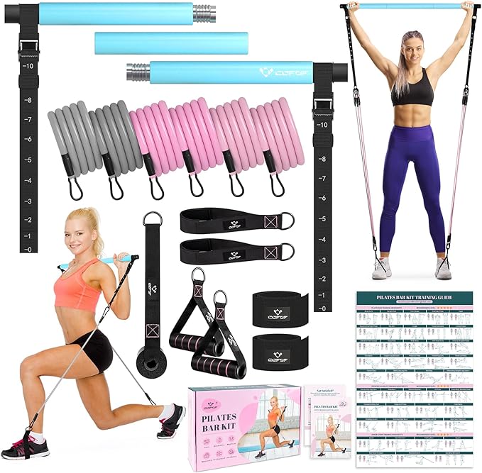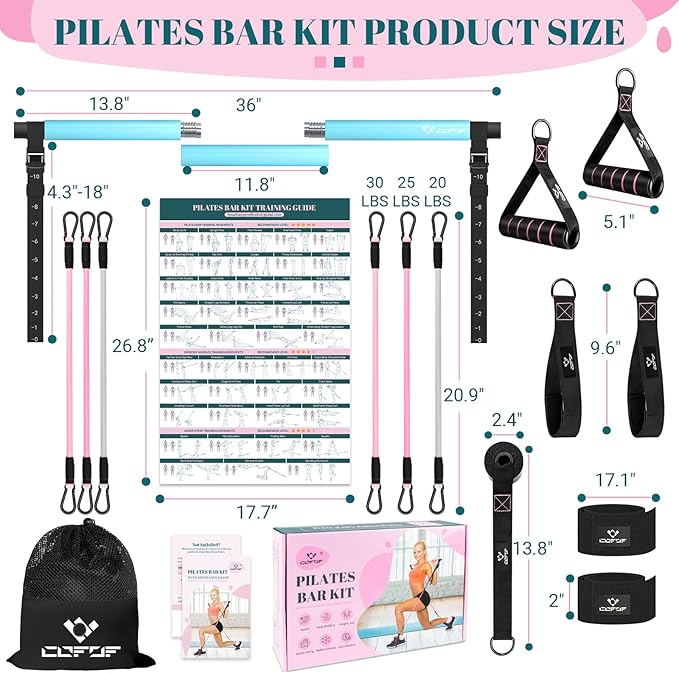 • [COFOF Pilates Resistance Bar Kit]: Our portable pilates bar kit includes 3 sections of screwed steel pipes, 6 resistance bands can be replaced & combined, 2 handles with soft high-density padding, 2 foot straps, 1 door anchor, 2 Ankle Straps, and 1 portable bag. We provide pilates bar workout posters and detailed instruction. Any questions about quality or use method, we will quickly provide you with an answer. Your complete satisfaction is our ultimate goal.