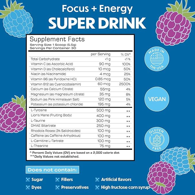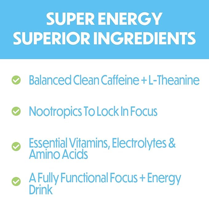 • Essential Energy - Packed with clean caffeine and loaded with Vitamin B12 makes this Super Drink your ultimate energy partner. This Super Drink gives you the morning kickstart you need, can boost your metabolism, mental clarity, laser focus and maximize endurance.