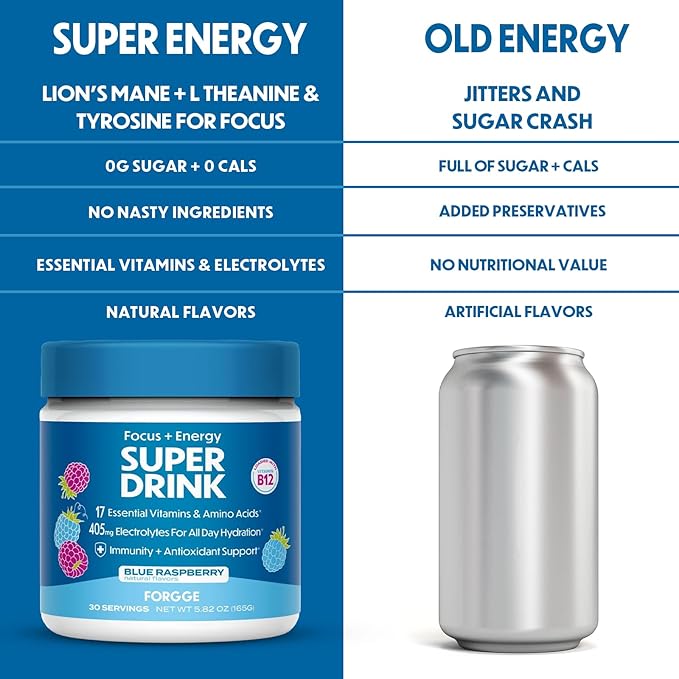 Forgge Healthy Energy Drink Mix - Clean Caffeine + B12, B6, C & D Vitamins - Sugar Free Energy Drink Powder with Electrolytes, Amino Acids, Antioxidants, Lions Mane - Vegan, Keto-Friendly - 30 SVG, Blue Raspberry