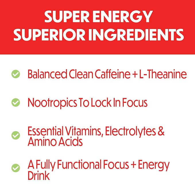 • Essential Energy - Packed with clean caffeine and loaded with Vitamin B12 makes this Super Drink your ultimate energy partner. This Super Drink gives you the morning kickstart you need, can boost your metabolism, mental clarity, laser focus and maximize endurance.