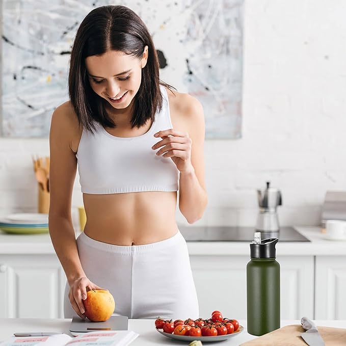 VEGOND 32 oz Insulated Water Bottle Stainless Steel Metal Water Bottles with Leak Proof Straw Lid & Spout Lid, Wide Mouth Double Walled Vacuum Travel Sports Bottle, Army Green