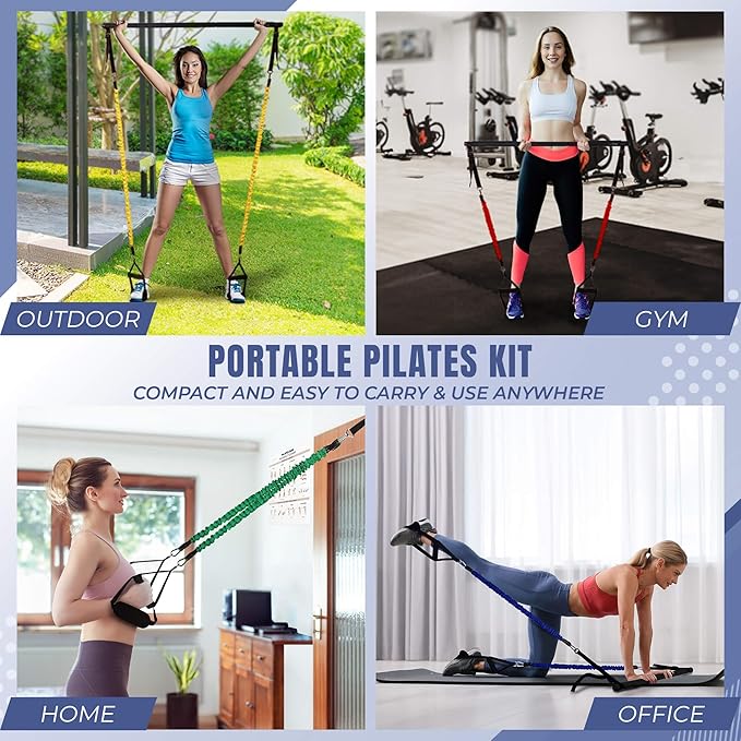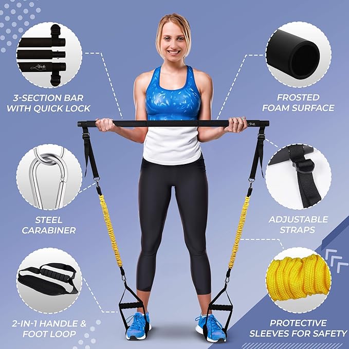 • Pilates Bar Kit: Our multi functional pilates bar is a home fitness equipment package designed to diversify your pilates workouts. This workout set includes a pilates bar, adjustable resistance bands, a door anchor, handles with wider foot loop, and a workout chart.