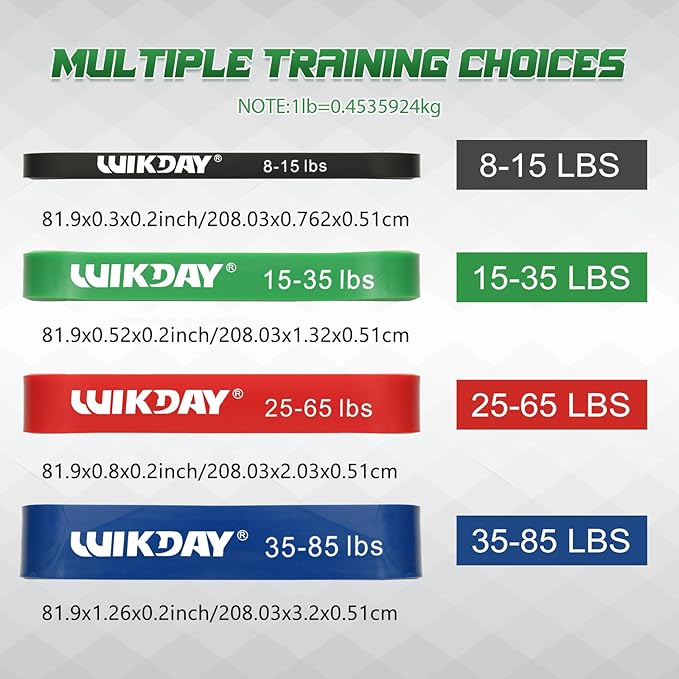 • Wide Applications: This professional exercise bands comes with 4 different levels of resistance. Black(8-15 lbs), Green(15-35 lbs), Red(25-65 lbs), Blue(35-85 lbs),. They are very suitable for beginners, fitness enthusiasts, athletes and other people