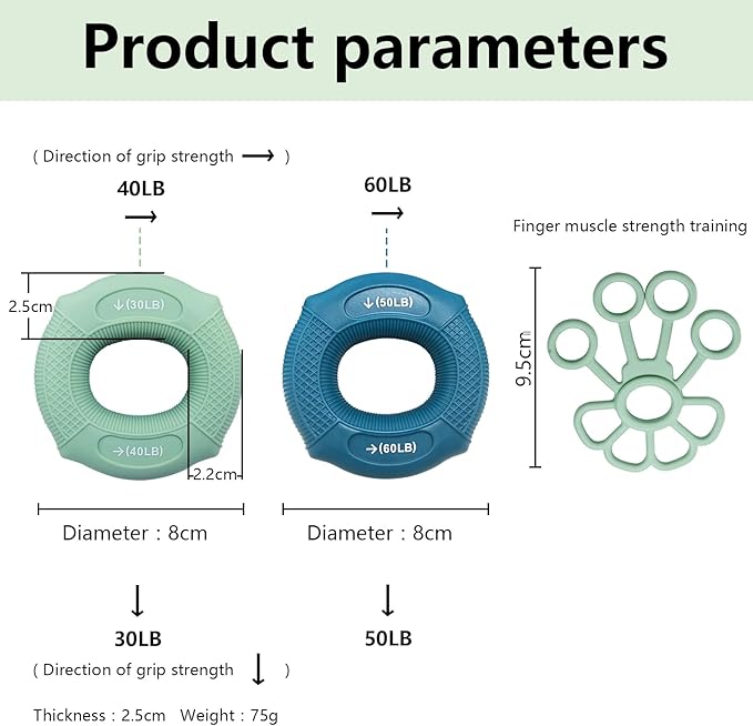 • 【Packaging Instructions】 The hand grip strengthener includes resistance levels of 30-40 pounds (light green) and 50-60 pounds (dark green). The finger trainer offers a resistance range of 4-7 kg (light green).