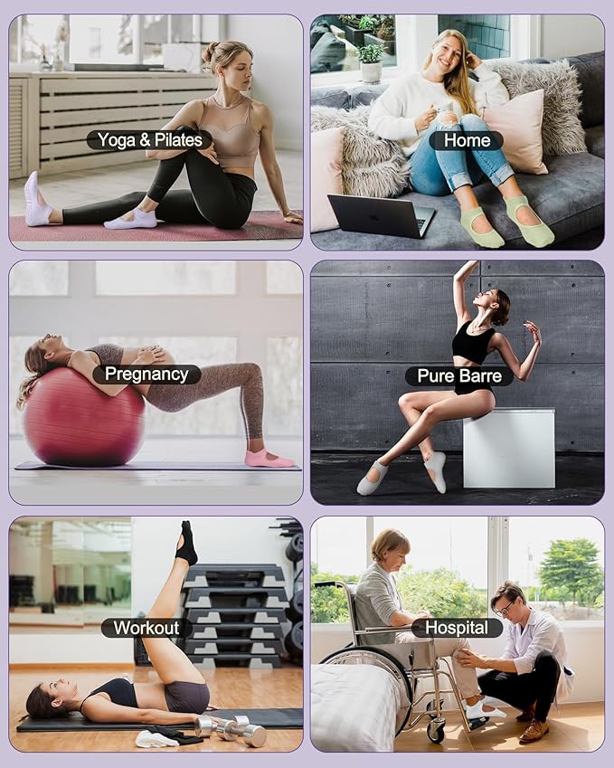 • 🧡【NON-SLIP GRIP DESIGN】Featured by sticky dots on the bottom of the non-slip yoga socks, our anti-skid socks offer better grip on hardwood floors, tile floors, gym floors, or Pilates equipment for improved stability & balance so that you can stay safe. Grips are made of soft and flexible silicone; they will not crack no matter how much you pull and guarantees a firm grip which allows you to push yourself when it really matters.