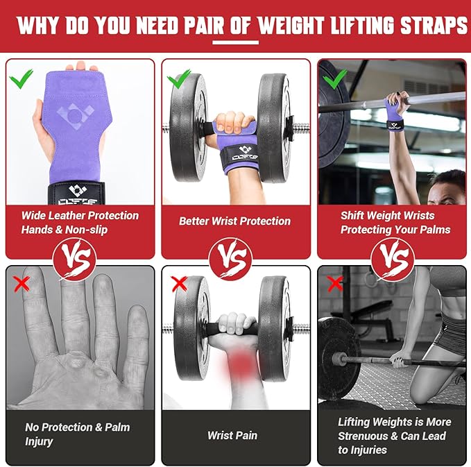 • Enhanced Grip: Professional leather deadlift straps can protect your hands from not only preventing calluses, but also peeling off existing calluses on your hands. Lifting straps take the pressure off your wrists and hands and help you lift heavier weights. More importantly, it improves your ability to exercise larger muscle groups.