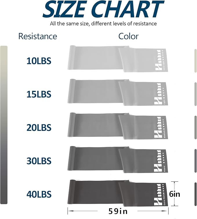 • Upgrade - Resistance band with handles, comes with door anchors and simple instructions. 5 Levels of Resistance, 5 resistance bands are 59in (150cm) long and 5.9in (15cm) wide, the 5 color resistance bands is yellow band (5 lbs), red band (10 lbs), green band (15 lbs), blue strap (20 lbs), gray strap (30 lbs). Additionally, the darker the gray and pink resistance bands, the heavier the resistance.