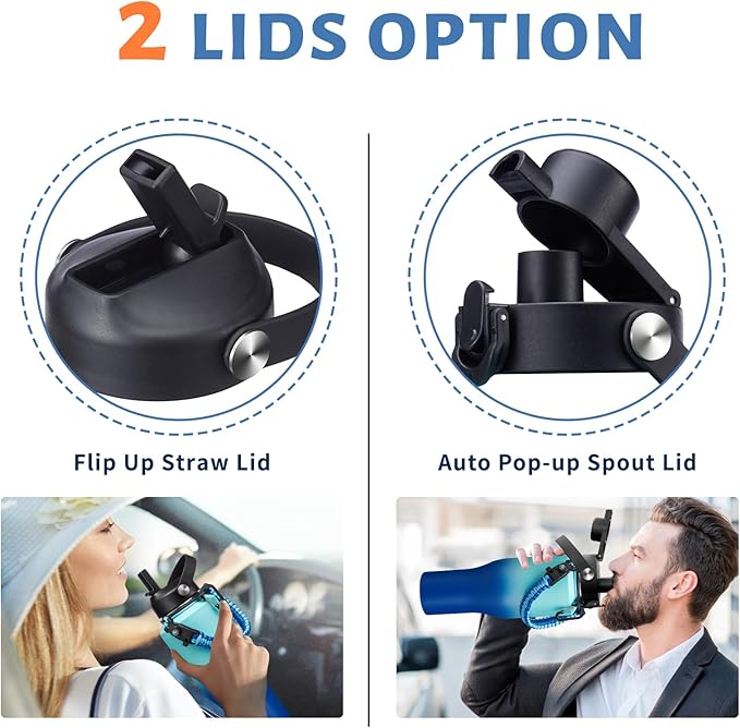 • LEAK-PROOF STRAW LID & AUTO SPOUT LID: This stainless steel tumbler thermal mug with straw and chug lid, both BPA-free, leak-proof and one-hand conctorl design, great car must have things!