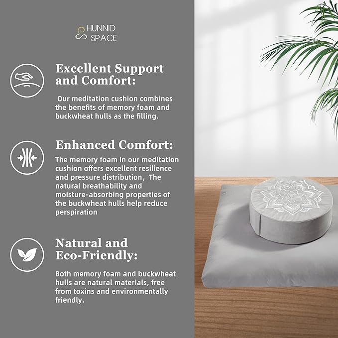 • ⚡ DUAL-LAYERED SUPPORT SYSTEM | DESIGNED TO LAST ▪️ Meditation Pillow: 16" x 5" | 100% natural buckwheat hulls for adjustable firmness ▪️ Meditation Mat: 32" x 3" | High-density shredded memory foam rebounds instantly → Never flattens! Retains shape for years with daily use.