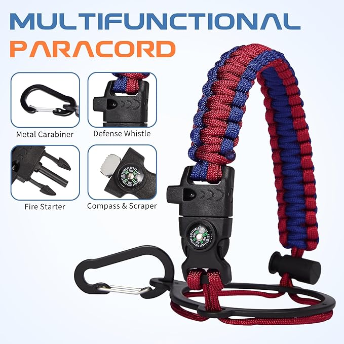 • PROTECTIVE BOOT & SURVIVAL PARACORD: Upgraded silicone boots prevent shattering and cracking when metal water bottle 128 oz accidental dropped. Humanized paracord handle for water bottles with compass, safety ring, carabiner, flint fire starter & whistle to be a perfect survival kit for adventure. Both design in individual styles to match the color of water canteen, stylish and practical in your daily use