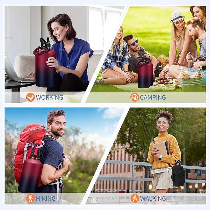 • SUPER VALUE COMBO: Buy 1 gallon water bottle 128 oz, get 9 accessories (2 x lids, 1 x survival paracord, 1 x carrying pouch, 1 x shoulder strap, 1 x silicone boot, 2 x straws, 1 x straw cleaner). With the most complete bottle accessories, these thermal water bottles are perfect for daily use at home, work, school, gym, road trips, hiking, camping or just hanging out