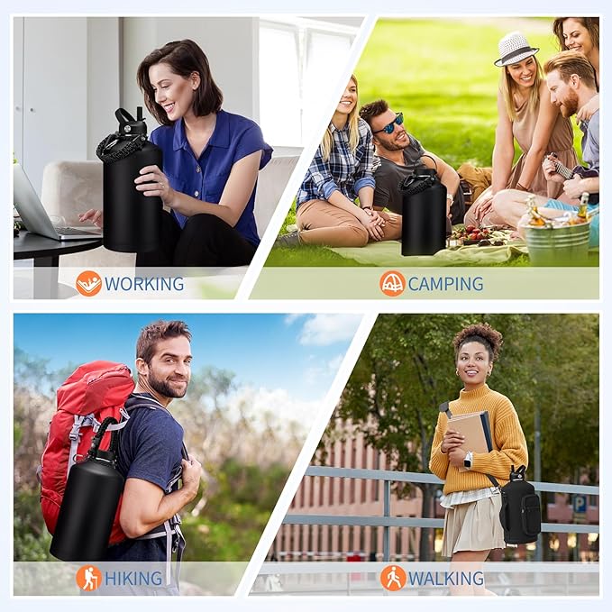 • SUPER VALUE COMBO: Buy 1 gallon water bottle, get 9 accessories (2 x lids, 1 x survival paracord, 1 x carrying pouch, 1 x shoulder strap, 1 x silicone boot, 2 x straws, 1 x straw cleaner). With the most complete bottle accessories, these thermal water bottles are perfect for daily use at home, work, school, gym, road trips, hiking, camping or just hanging out