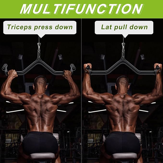 • Ergonomic V Bar Design: This cable attachment allows you to change the way you work out your back muscles and make your exercise more effective. It eliminates wrist pain and tennis elbow while strengthening your obliques, latissimus dorsi, scapulae, and other back muscles.
