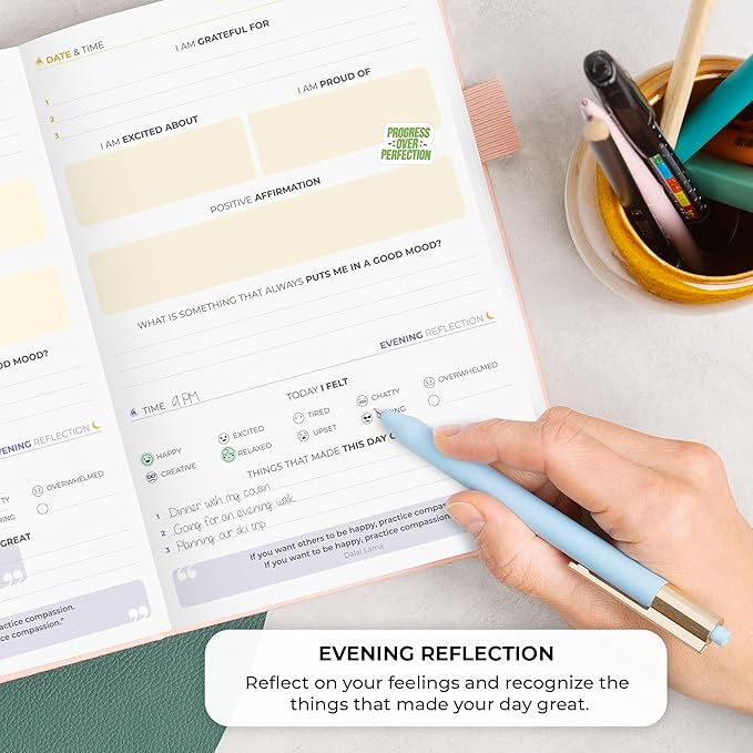• YOUR DAILY DOSE OF POSITIVE THINKING – This daily journal with prompts requires just 4 minutes a day and helps you focus on the good, practice gratitude and affirmations, and be mindful of your feelings and emotions.