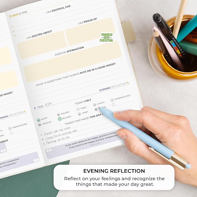 • YOUR DAILY DOSE OF POSITIVE THINKING – This daily journal with prompts requires just 4 minutes a day and helps you focus on the good, practice gratitude and affirmations, and be mindful of your feelings and emotions.