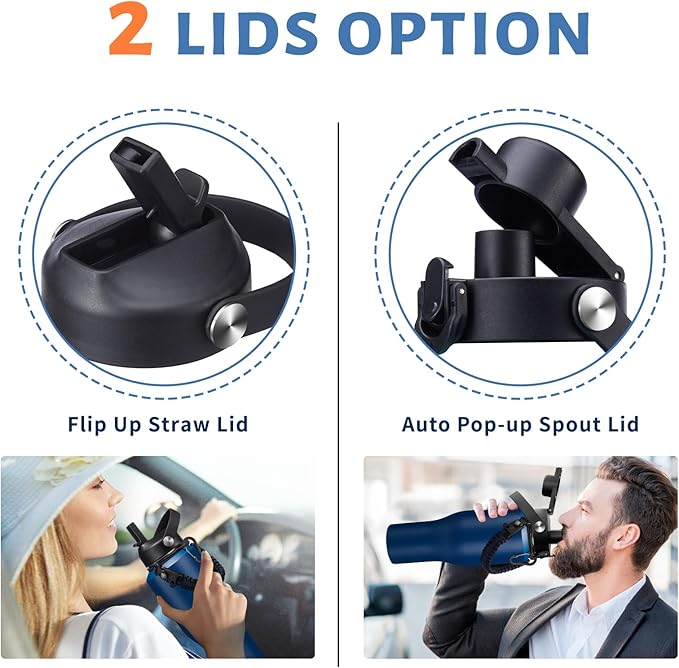 • LEAK-PROOF STRAW LID & AUTO SPOUT LID: This stainless steel water bottles with straw lid and chug lid, both BPA-free, leak-proof and one-hand conctorl design, great car must have things!