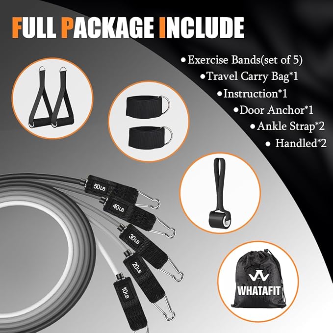 • Product list:Our fitness bands includes 5 Tube resistance Bands, 2 Soft Cushioned Handles, 2 Ankle Straps,1 Door Anchor,1 Exercise Guidance, 1 Carrying Bag