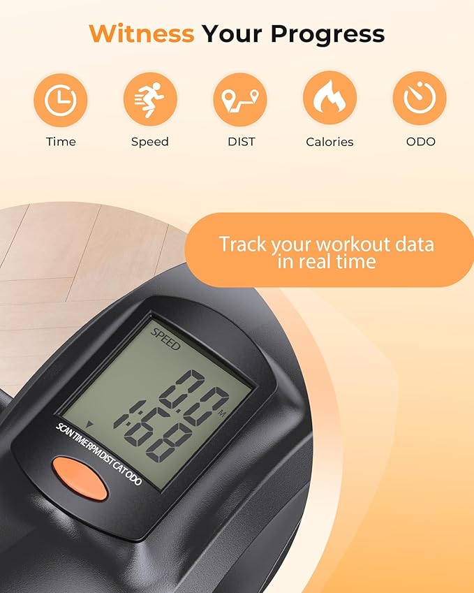 • DIGITAL MONITOR: screen tracking of workout data: heart rate, mileage, speed, calories. Under desk bike pedal exerciser can also be Bluetooth connected to KINOMAP and Zwift, so that you can easily grasp your body data and follow tutorials to exercise