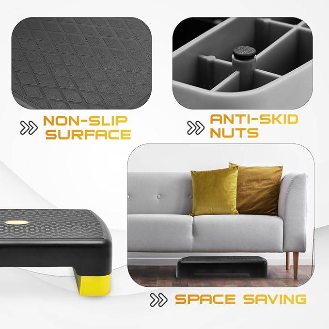 • NON SLIP SURFACE: Platform with diamond knurl surface provide more grip and traction for a steady, space efficient and comfortable step workout experience