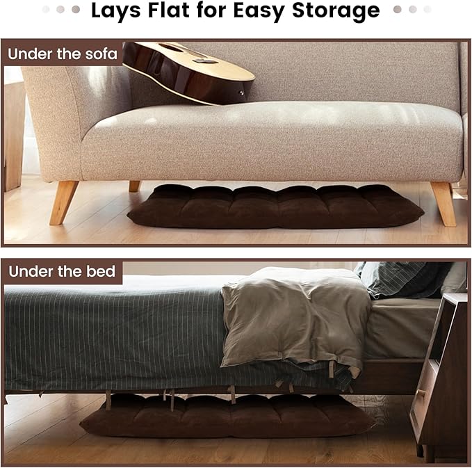 • Easy Storage and Attractive Appearance: Save space with this foldable floor sofa chair that can lie flat for easy storage under your beds or couch. The stylish appearance matches your other furniture well. Our comfy chair is a perfect addition to your living room, bedroom, kid's playroom, movie room, kotatsu, reading nook, or office. No assembly required. Overall Flat Dimensions: 41.5” x 22” x 6”(L x W x H). 90 Degree Position Dimensions: 22” x 21.5” x 21.5”(L x W x H).