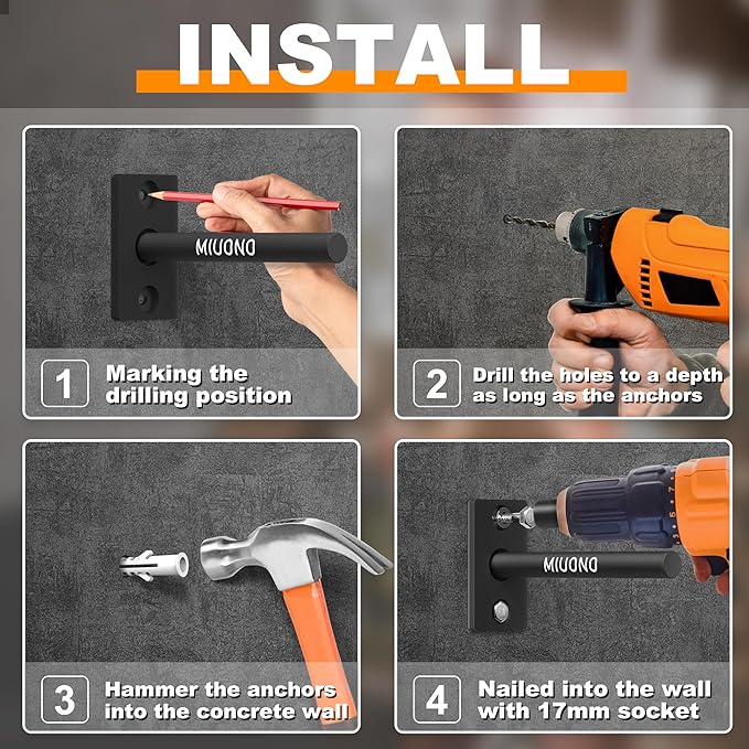 • Easy Installation: Your package includes 4 weight racks for plates and 8 large hex lag screws suitable for wood and concrete walls. A word of caution: Avoid mounting on drywall. Ensure you install the holder on a wall that can support its weight.