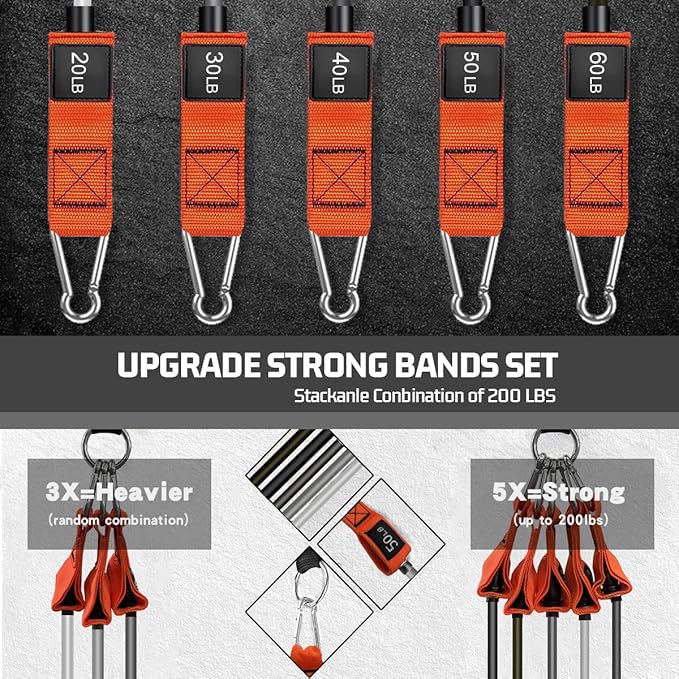 • Adjustable Resistance Bands, Maximum equivalent of 200 lbs - Come as a set of 5, 48-inch long colored exercise bands.You can use the bands independently or in any combination with a maximum resistance level of 200lbs