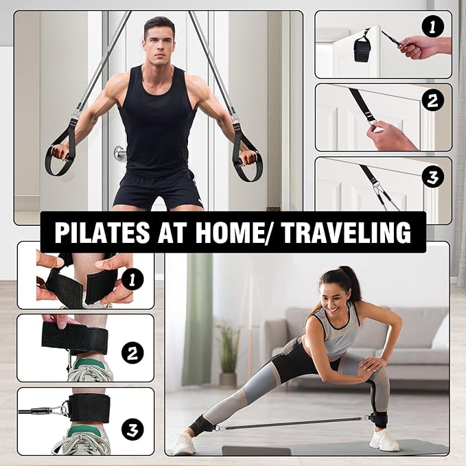 • 【Upgraded Bbtops Pilates Bar】Pilates Bar Kit with Resistance Bands composed of three steel pipes,Six resistance bands equipped are made of natural latex, upgraded adjustment buckle and nylon rope with clear graduations. Just press the button easily, you can adjust the nylon rope to the desired length more quickly and accurately when training different movements. It can help you improve your strength, flexibility, and balance. which is strong, durable, and non-slip.