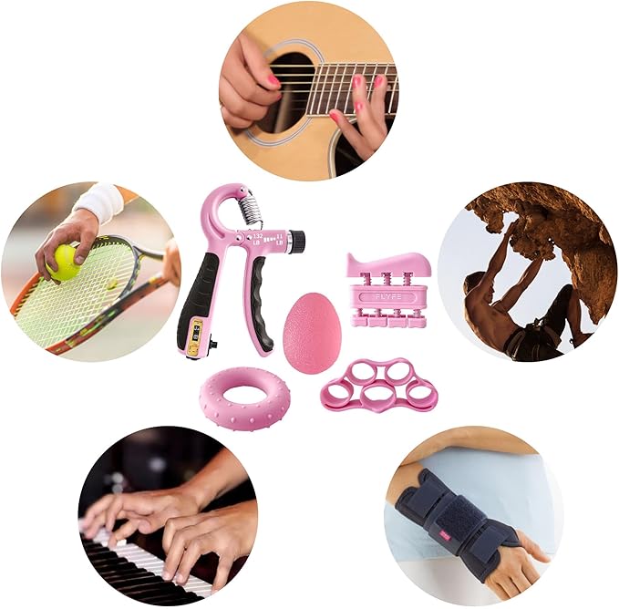 • Grip Strengthener Kit: Includes adjustable hand gripper (11-132Lbs), finger exerciser (4Lbs per finger), grip ring (50Lbs), stress relief ball, and stretchers (6.6Lbs, 8.8Lbs, 11Lbs); targets different muscle groups