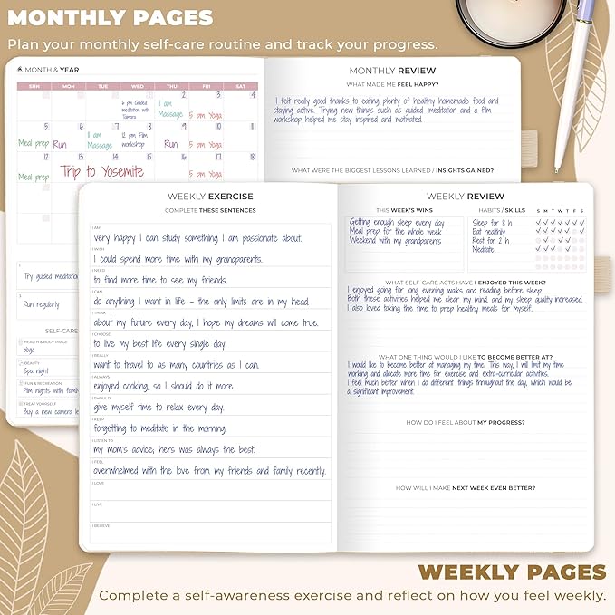 • BUILD A HAPPIER & HEALTHIER MINDSET FOR YEARS TO COME: This self care notebook is filled with prompts, open-ended questions, wellness trackers, and many other tools to help you pinpoint the changes you can make to improve your well-being.