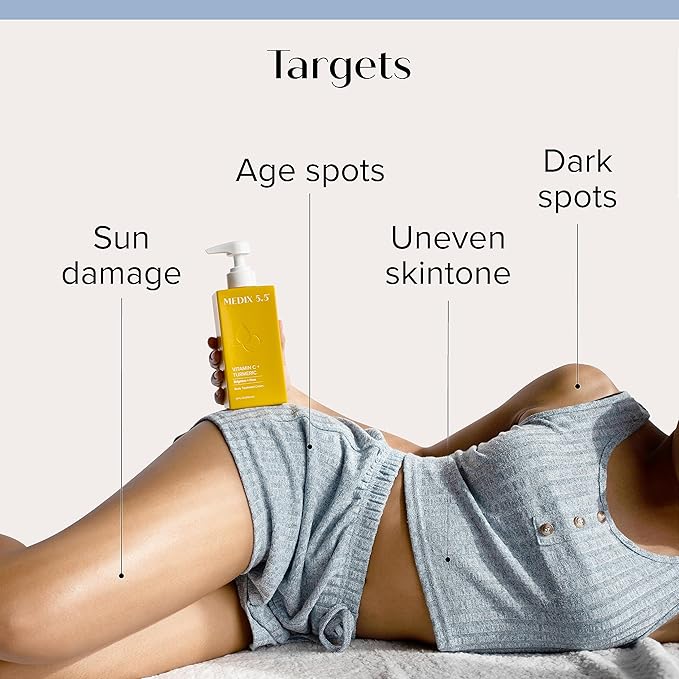 • EFFECTIVE INGREDIENTS – Medix 5.5 Vitamin C Cream Brighten + Firm Body Lotion is formulated with the perfect combination of effective anti aging + brightening ingredients, including Shea Butter, Aloe Vera, Ferulic Acid, Turmeric, Vitamin E, Glycerin, Ginger, & More. Shea Butter deeply moisturizes the skin, improves elasticity, & provides a protective barrier to help prevent moisture loss. Vitamin E helps protect skin against free radicals + UV Damage. Aloe Vera helps calm + hydrate the skin.