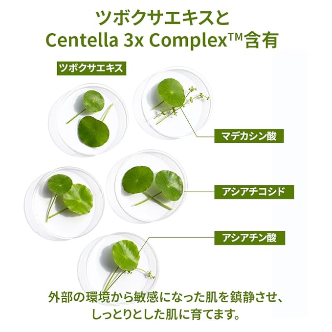 • CENTELLA 3X COMPLEX: The following components of Madecassic Acid, Asiaticoside, and Asiatic Acid come from a leaf called “Centella asiatica”.