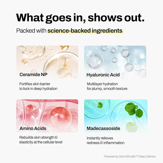 • Advanced DermiShuttle Technology: Our innovative DermiShuttle system ensures that potent active ingredients penetrate deeply into the skin, providing noticeable and long-lasting improvements in overall youthfulness.