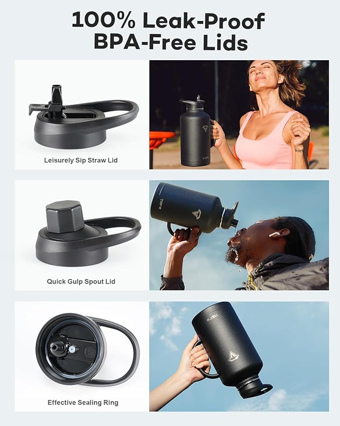 • No Leakage, No Spills: Our stainless steel water bottles comes with a dust-proof flip straw lid and a spill-free spout lid, both 100% leak-proof and spill-proof. The two lids showcase a vibrant color-contrast design, harmonizing with the bottle body's color and adding an extra touch of allure.