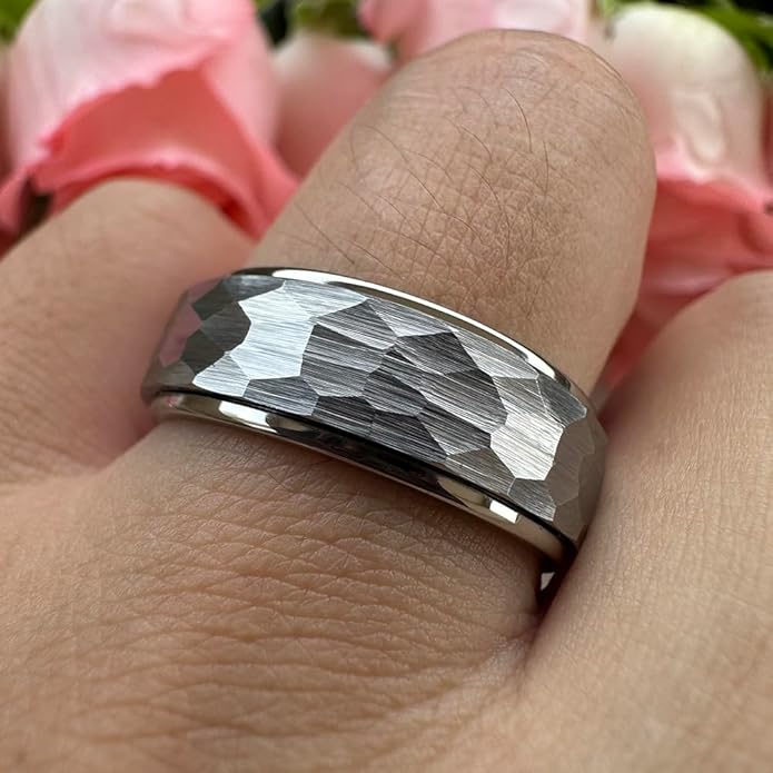 8mm Silver/Black/Gold Spinner Tungsten Titanium Fidget Rings for Men Women Anxiety Released Hammered Design Engagement Wedding Band Stepped Edges Comfort Fit