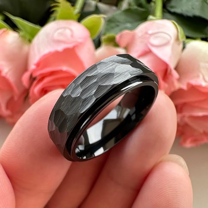 • 8mm Silver / Black / Gold Spinner Tungsten Titanium Fidget Rings for Men Women Anxiety Released Hammered Fashoin Jewelry Engagement Wedding Band Stepped Edges Comfort Fit