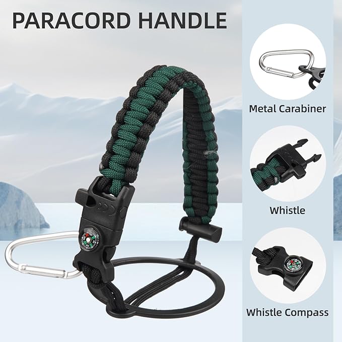 • The large capacity gallon water jug comes in various sizes, including 50 oz, 64 oz, 87 oz, and 128 oz, with a range of colors to choose from according to your need. All sizes of bottles equip with a paracord handle and a pouch for easy carrying