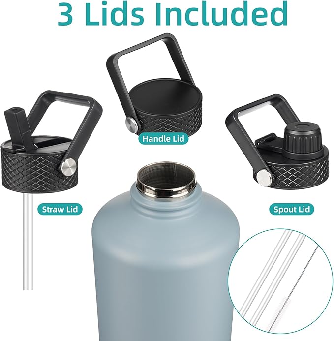 • The water bottle comes with 3 lids for different beverages, a sip lid for hot drinks, a straw lid for iced beverages, a flex-removable lid(2 different handle lids ship at random) for smoothies or fruit drinks. All lids are BPA-free, leak-proof, and dust-proof, catering to your need