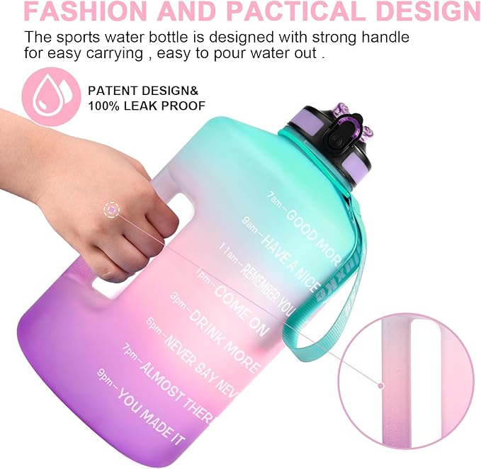 • 🍋COMFORTABLE DESIGN: The motivational water bottle is designed with strong handle and nylon woven strap, add leak proof lid and straw, 8 time markers from 7am to 9pm on the water bottle body, our big hydro jug is easy to carry to the outside, gym, office and outdoor recreations, a must-have large hydro water bottle jug accurately remind you to drink the water, it's even easier than ever to drink the perfect amount of water each day.