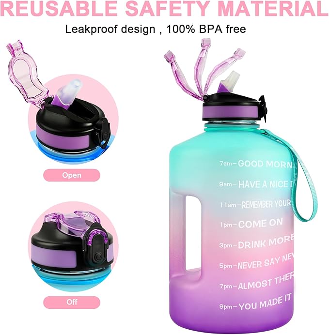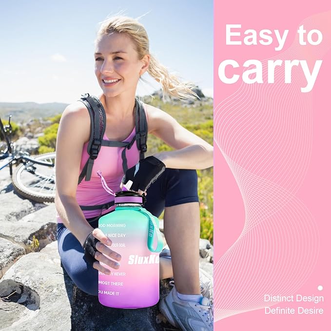 • 🍋WIDE MOUTH & SOFT SILICONE NOZZLE: Water is the source of life, the wide mouth of the 1 gallon sport bottle make it easy to add ice cube, lemon or other fruits in your water, no need to lift the water jug bottle, just one click pop-up, the comfortable silicone nozzle will inspire you want to drink more water with the encouraging quote reminders of the daily.