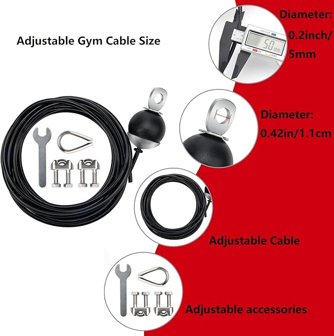 • Cable diameter of 0.2inch/5mm includes the black nylon coating Maximum weight capacity is 500 LBS.Optional length, easy to install. Come with accessories tools, and support to adjustable the size according to your cable machine.