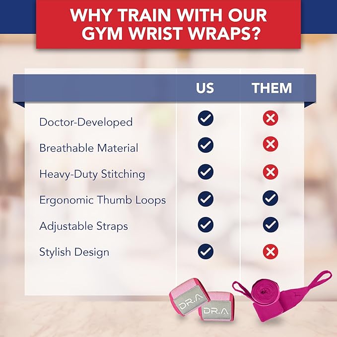 • Dr. Arthritis’ gym wrist wraps have been developed by doctors to offer maximum support for your wrists as you train & lift heavy weights by securing them in a neutral position, significantly decreasing tension in your thumbs & wrist joints.