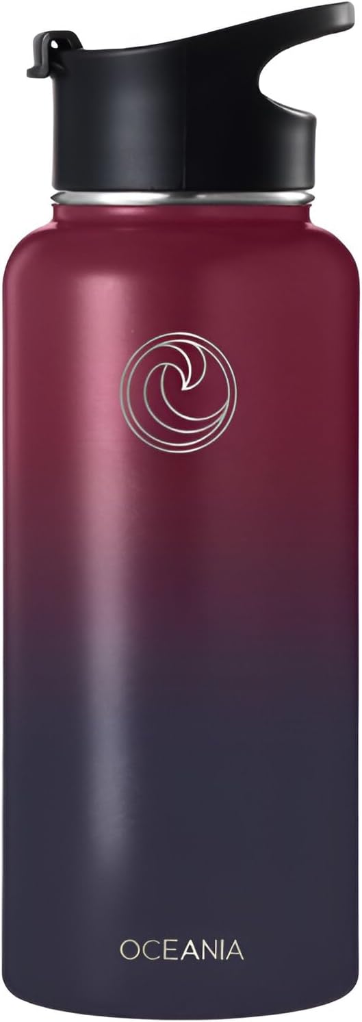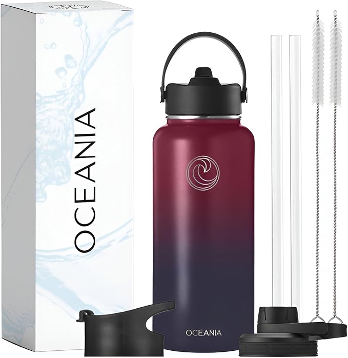Oceania Flask 32oz Stainless Steel Water Bottles | Modern, Leakproof, Hydro BPA-Free, Insulated Water Bottle with 3 Lids, 3 Straws & 2 Straw Cleaning Brushes | Simple Camping & Hiking Water Bottles
