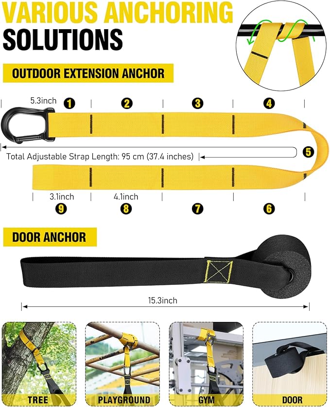 • Easy Set Up And Use - Workout equipment for home gym workouts with door anchor and adjustable resistance training extension strap, easy-to-adjust One-Buckle-System is the perfect portable gym used indoors and outdoors. It can be quickly connected to most fixtures in any place, such as doors, rafters, trees, ceiling brackets and power racks