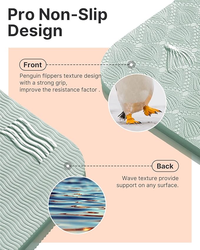 • Non-Slip Yoga Mats: Surface flippers webbing design, inspired by the penguin's flippers, improve the resistance factor, and sweat without slipping, strong and durable to prevent ripping suitable for yoga, pilates, weight training, and other floor exercises. Alignment Marks Yoga Mats are more helpful for beginners.